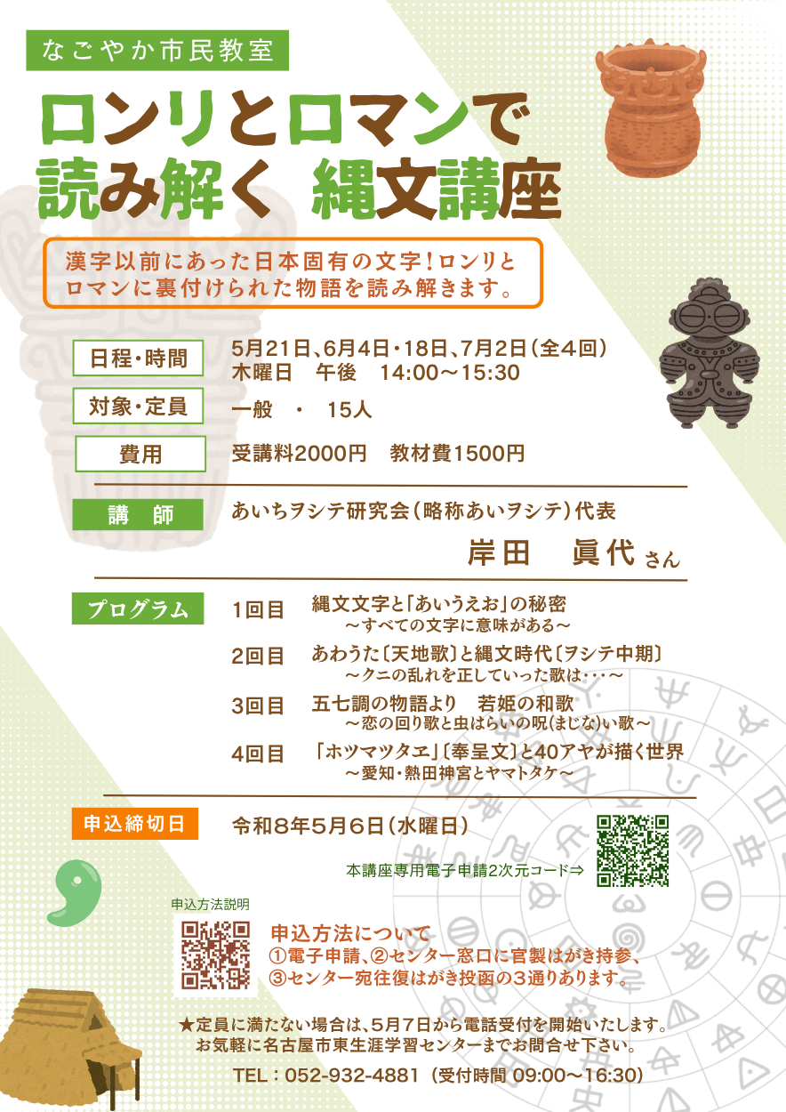 | 内容 | 前期は当センターで3種類の「なごやか市民教室」を開講。 それでは、古代ロマンに思いを馳せる「ロンリとロマンで読み解く縄文講座」を